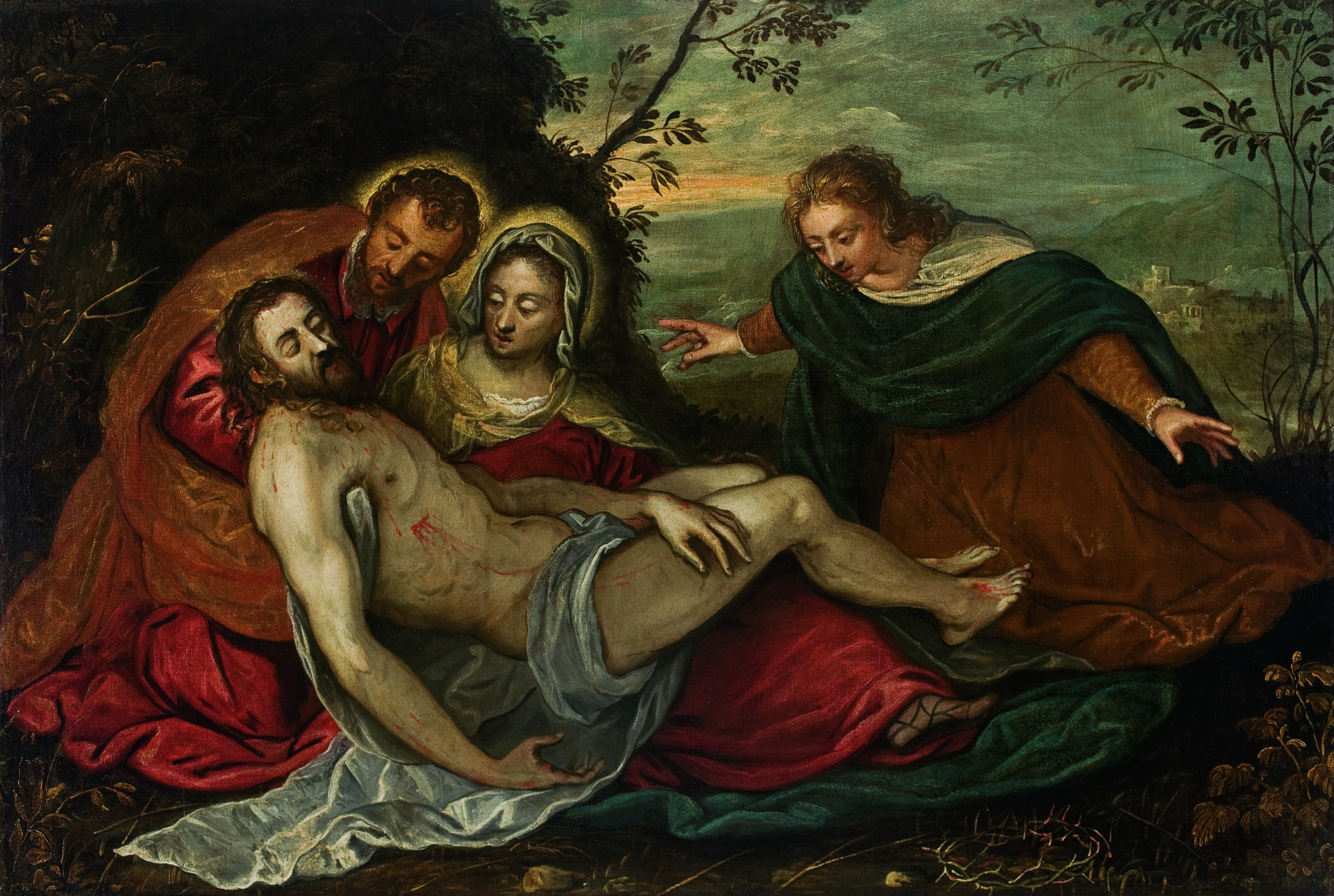 Expoente do maneirismo, o pintor de Veneza faz uso de sua célebre habilidade para os pequenos detalhes. A obra retrata uma Lamentação sobre o Cristo Morto, cena que se intercala no ciclo cristológico entre a Deposição da Cruz e a Deposição no Túmulo.